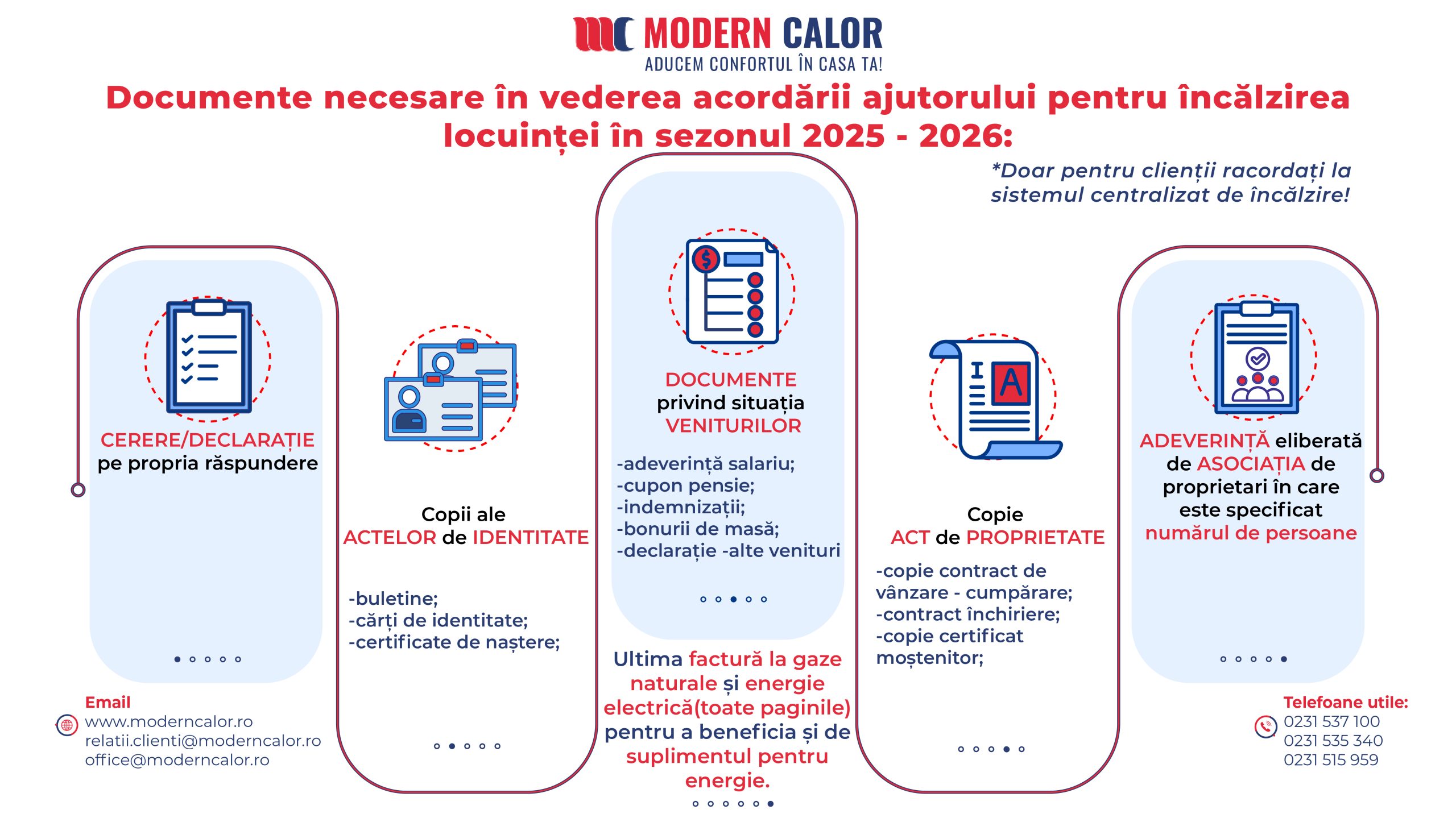 Formularele pentru acordarea ajutorului la încălzirea locuinței și suplimentului pentru energie pot fi descărcate de pe site-ul societății – www.moderncalor.ro/comunicate – unde sunt publicate și condițiile de eligibilitate și lista completă a documentelor necesare.